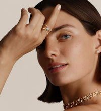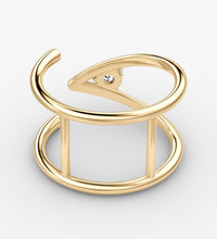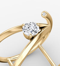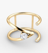 | In this daring and unique style, two solid 14k gold bands encircle your finger, connecting at one end to form an angular V that secures your Round Brilliant diamond in place. The two starting ends frame the knife edge V setting on either side, with two smaller Round Brilliant cut diamonds set along each tip for extra shine. Collection: gemviora Collection |
